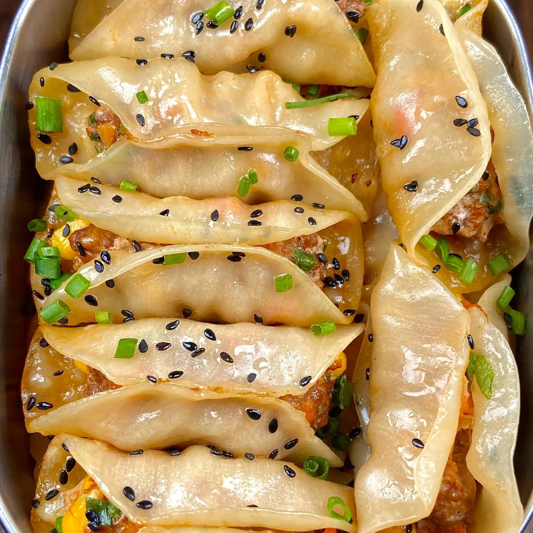 酥脆的饺子,里面填满了调味猪肉。
